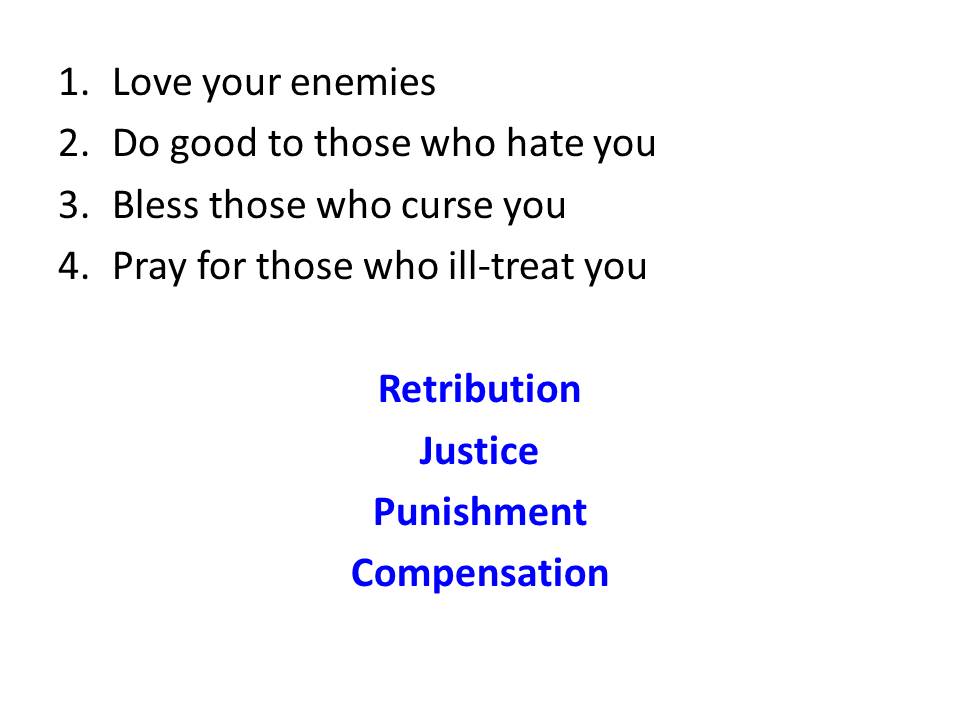 Retribution, justice: punishment and making amends, are not for us to demand. Not only that, but it is entirely opposite to the attitude Jesus demonstrated to us.